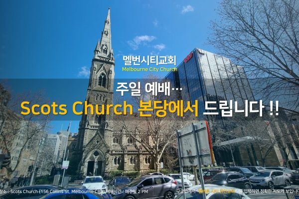[2026년 3월 1일 멜버른시티교회 주일 예배 안내] (호주멜버른시티 CBD 안에서 예배 드립니다) . . 장소: Scots Church 본당 시간: 2 PM 내용: 6차 연대기적 성경 […]